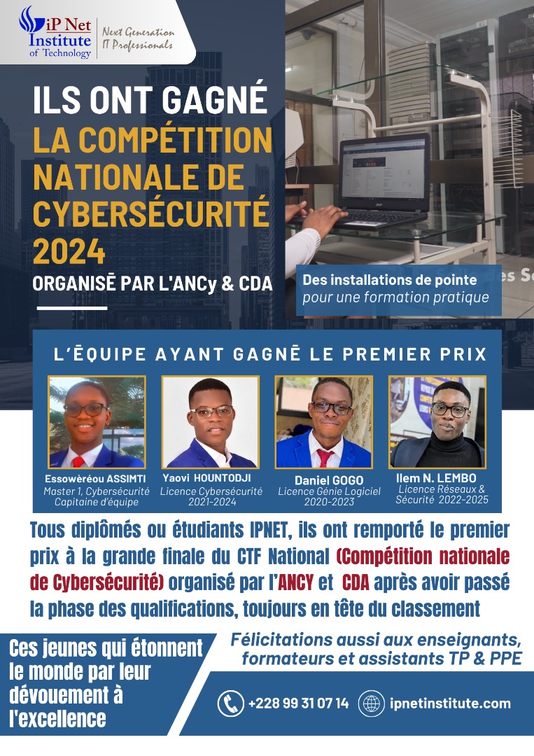 A nos étudiants & diplômés lauréats de cette compétition de piratage informatique organisé par l’ANCY (Agence Nationale de Cybersécurité du Togo) & CDA (Cyber Defense Africa)